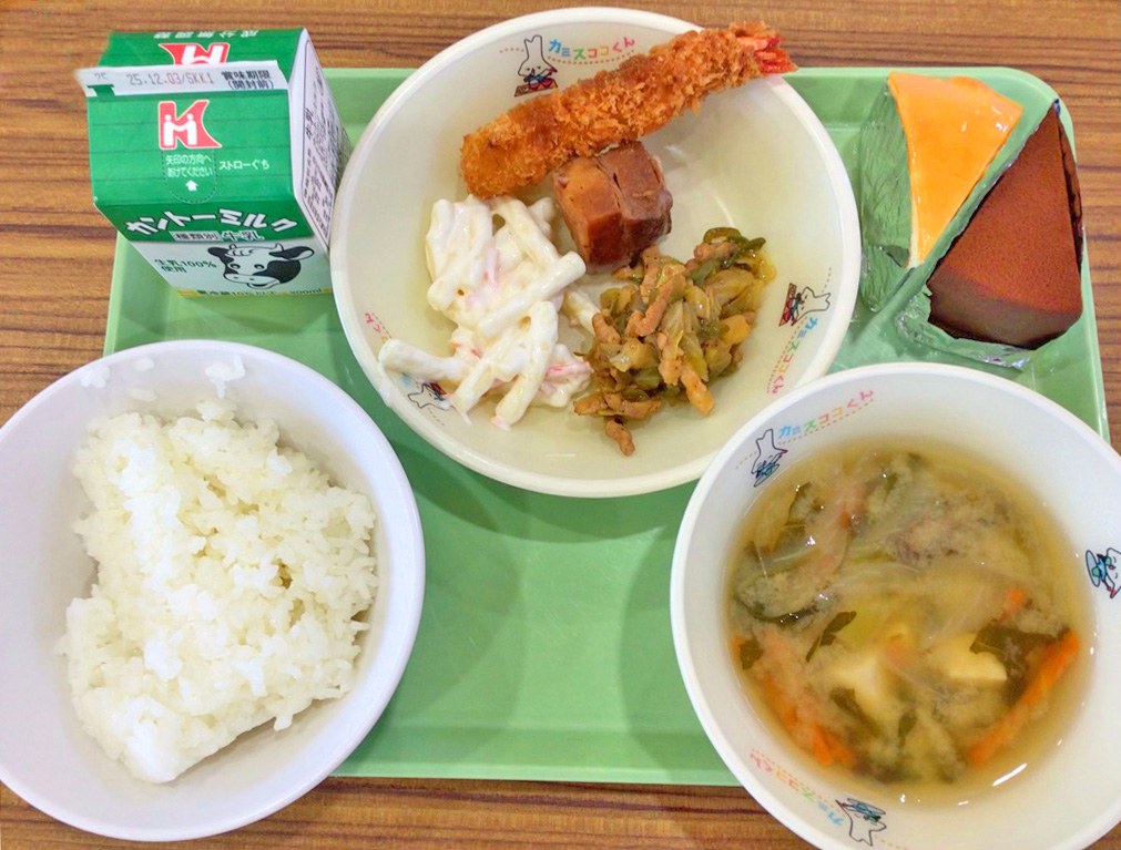 • ※写真の給食は、主菜はエビフライと豚の角煮、副菜は小麦豚のホイコーローとマカロニサラダ、デザートはチョコケーキとチーズケーキ、飲み物は牛乳を選びました。主食、副菜、汁物の内容は、提供日によって異なります。